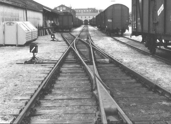 I Fig. 84 er vist et Skraaspor, der skærer tre parallele Spor, af hvilke det midterste er forbundet med Skraasporet ved et enkelt Krydsningssporskifte.